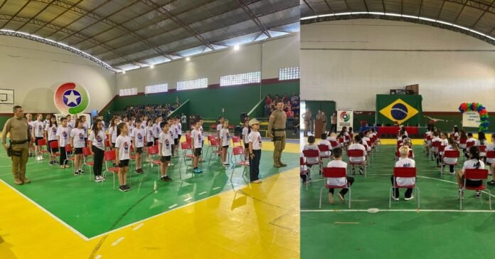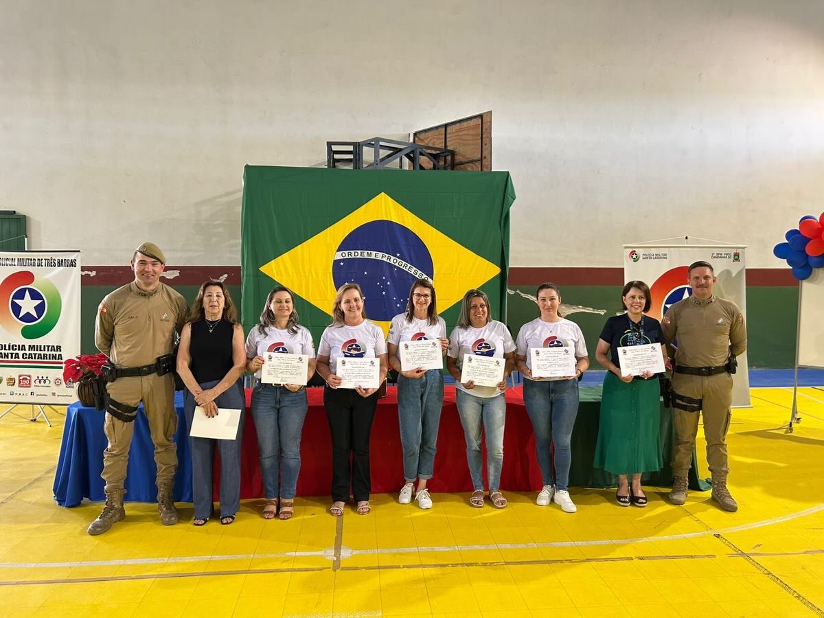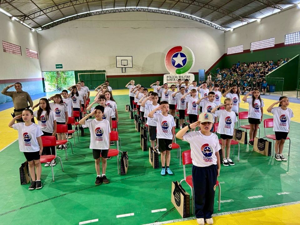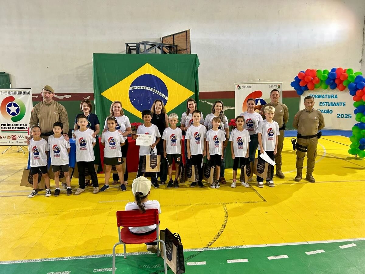 Nesta sexta-feira, 5 de dezembro, a Escola de Educação Básica Municipal Guita Ferdmann, em Três Barras, celebrou a formatura de 40 alunos do 3º ano que participaram do Programa Estudante Cidadão, desenvolvido pela Polícia Militar.