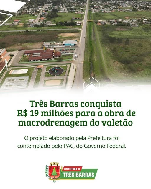 A Prefeitura de Três Barras conquistou R$ 19 milhões em recursos do PAC, através do Orçamento Geral da União, para a execução da obra de macrodrenagem do valetão.