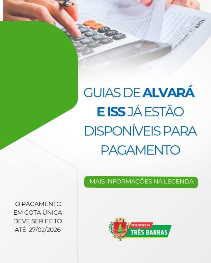 A Prefeitura de Três Barras informa que já estão disponíveis, para retirada, as guias para pagamento das taxas de Alvará de Licença, Localização e Funcionamento, destinada às empresas do município, e do Imposto Sobre Serviço (ISS) Fixo, para os profissionais autônomos.