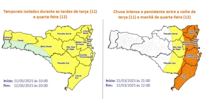 Durante as tardes de terça (11) e quarta-feira (12), há condições para temporais isolados em todas as regiões catarinenses, acompanhados por raios, rajadas de vento e, eventualmente, queda de granizo. O risco é moderado para ocorrências associadas à destelhamentos, danos na rede elétrica, queda de galhos e árvores e alagamentos e enxurradas pontuais.