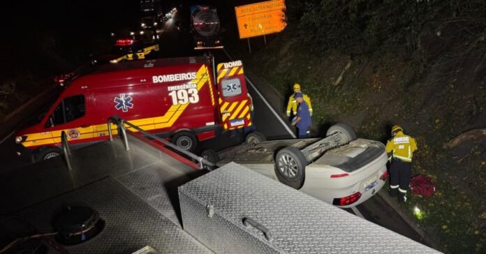 Após a chegada no local, constatou que tratava-se de capotamento, o veículo estava as margens da pista de rolamento. Tratava-se de um veiculo marca VOLKSWAGEN VW, branco, modelo Jetta, 2013, conduzido por um homem de 24 anos, que a principio nada sofreu, relatou apenas um desconforto na região das costas e na perna direita, todavia sem suspeitas de fraturas.