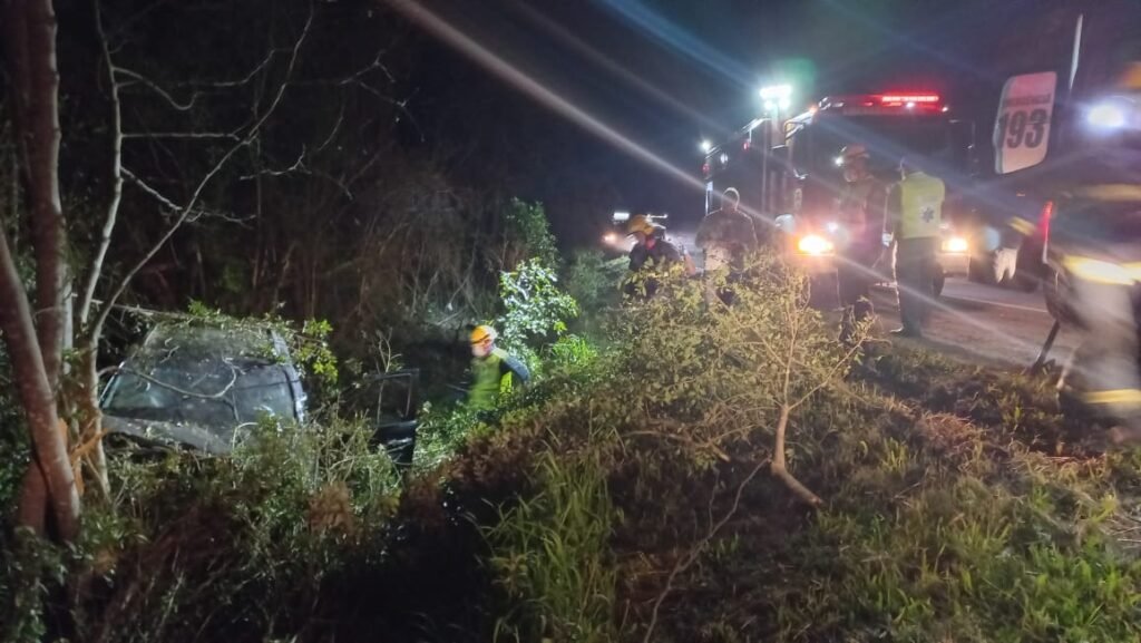 No local, um veículo Toyota SW4 estava fora da pista, o veículo era conduzido por um senhor de 72 anos, o qual encontra-se no interior do veículo, consciente, confuso e sem lesões aparentes.