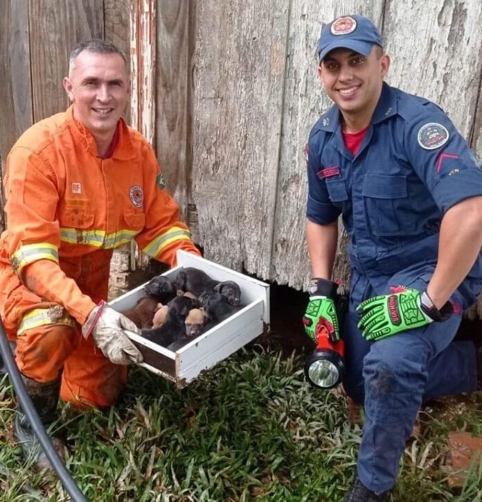 Ao chegar no local, confirmou-se a ocorrência, sendo encontrados oito filhotes de cachorro que estavam embaixo de uma residência e havia risco da água subir em decorrência das chuvas.