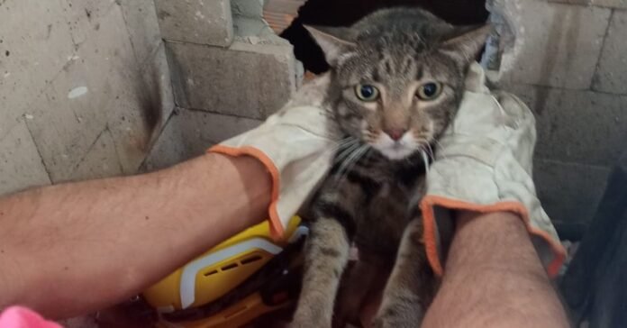 No local, as guarnições, constataram que um felino (gato), de médio porte, encontrava-se preso, dentro de um do chaminé da churrasqueira do apartamento, com uma profundidade de aproximadamente 2,50mts. Após analisar a situação, foi aberto um acesso pela churrasqueira, com um buraco de aproximadamente 30cm de diâmetro, e após 75 minutos de trabalho, foi resgatado o animal em segurança sendo constatado que o animal apresentava-se saudável, e foi entregue ao responsável.