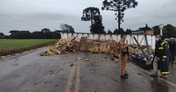 Caminhão carregado com bebidas tomba na BR-476 em São Mateus do Sul