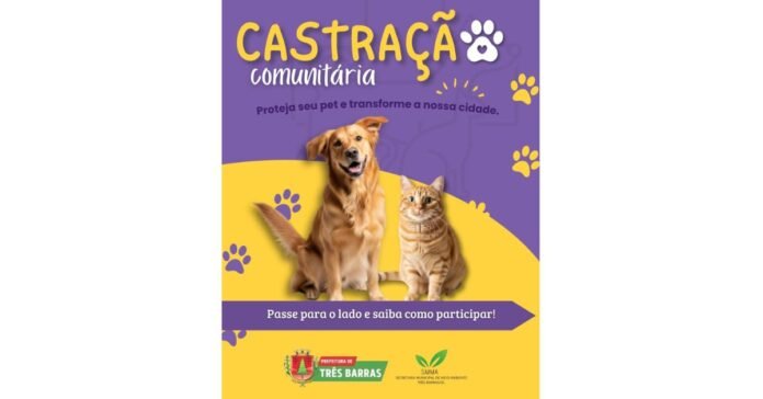 A Prefeitura de Três Barras, através da Secretaria Municipal do Meio Ambiente, tem o prazer de anunciar uma campanha de castração gratuita de cães e gatos para a comunidade. A castração é um ato de amor e responsabilidade que previne doenças, evita a superpopulação e ajuda a controlar o abandono de animais.