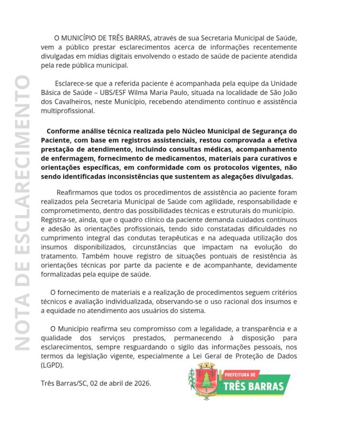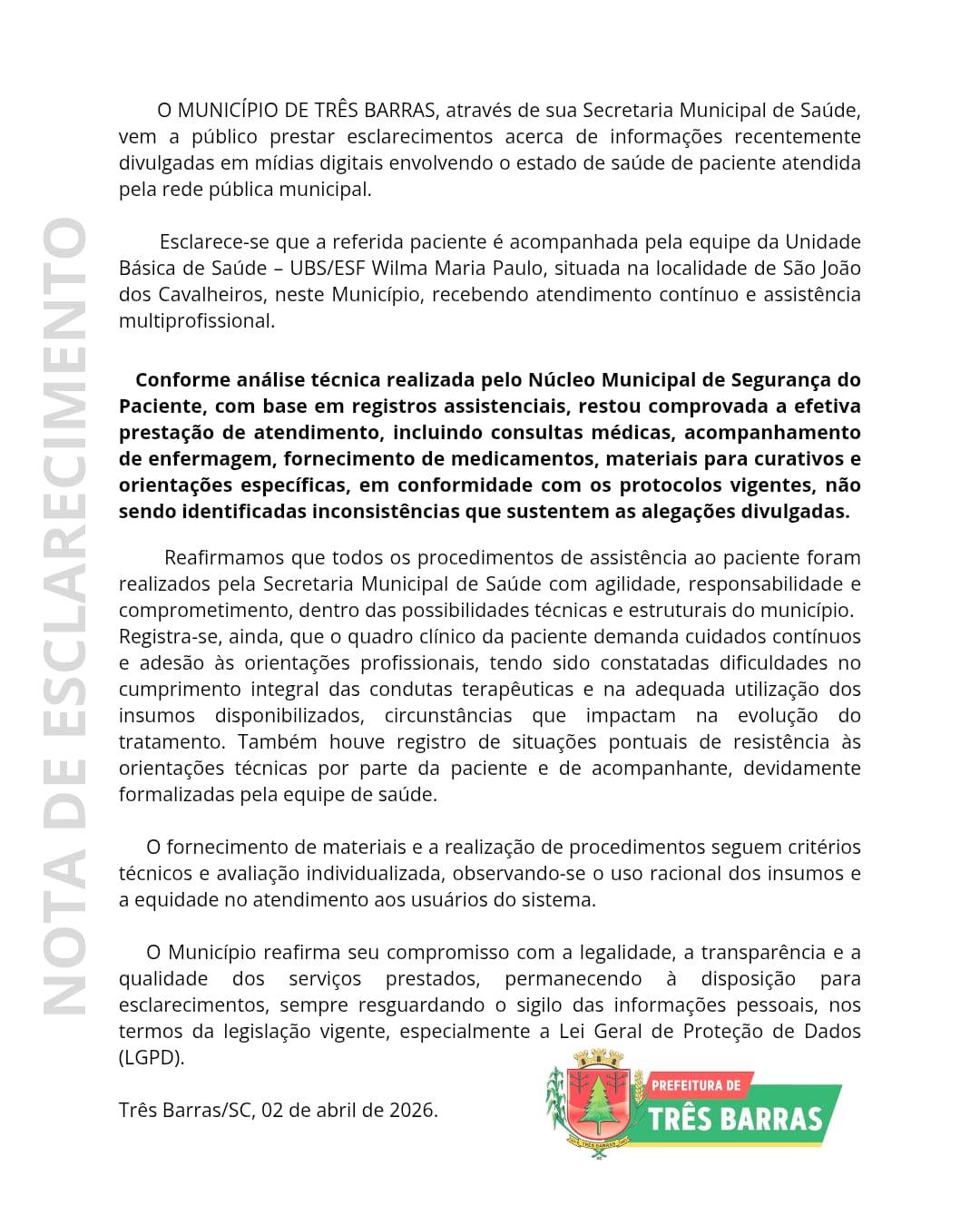 InícioCidadeConfira a Nota de Esclarecimento na íntegra Cidade Confira a Nota de Esclarecimento na íntegra Por: Equipe A Gazeta Tresbarrense 7 de abril de 2026 FacebookTwitterPinterestWhatsApp Últimas notícias Destaque Quase 100 vagas de emprego estão disponíveis no SINE de Canoinhas Está em busca de uma oportunidade de trabalho? A... Polícia Polícia Militar atende tentativa de furto em escola Na noite desse domingo, 05, A Polícia Militar foi... Polícia Mulher é encontrada morta no Rio Iguaçu em São Mateus do Sul Uma mulher foi encontrada morta no início da tarde... - Anúncio - - Anúncio - Equipe A Gazeta TresbarrenseSomos um jornal regional com mais de 20 anos de existência.