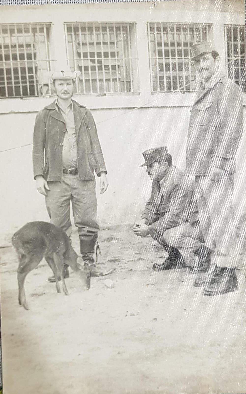 Júlio Gritz. Miguel Morvan e um civil. Fundos da delegacia Itaiópolis. Veado domesticado. Por volta de 1975