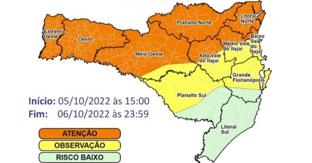 Espera-se chuva intensa em curto intervalo de tempo, temporais com intensas rajadas de vento, acompanhada de raios e eventual queda de granizo, sobretudo no Grande Oeste, norte de SC e áreas isoladas do Vale do Itajaí, onde o risco para ocorrências associadas à chuva, temporais e rajadas de vento é moderado a alto.