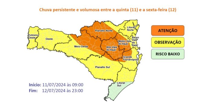 Devido aos volumes previstos, associados aos níveis mais elevados e o solo encharcado, o risco é alto para inundações na região do Alto Vale do Itajaí, podendo atingir níveis de emergência em municípios como Ituporanga, Taió, Rio do Oeste Laurentino e Rio do Sul entre a noite de quinta-feira (11) e a madrugada de sexta-feira (12). Já nas regiões do Médio e Baixo Vale, e nas bacias hidrográficas da região do Planalto Sul, os rios devem se manter em níveis de atenção.