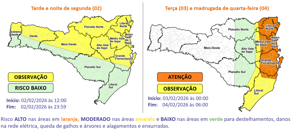 A partir da tarde de segunda-feira (02), uma baixa pressão no interior do continente favorece a formação de temporais isolados com raios, rajadas de vento e eventual queda de granizo, especialmente nas áreas que fazem divisa com o Paraná, no Vale do Itajaí e na Grande Florianópolis, onde o risco é moderado para ocorrências associadas a destelhamentos, danos na rede elétrica, queda de galhos e árvores e alagamentos. Nas demais regiões, o risco é baixo.