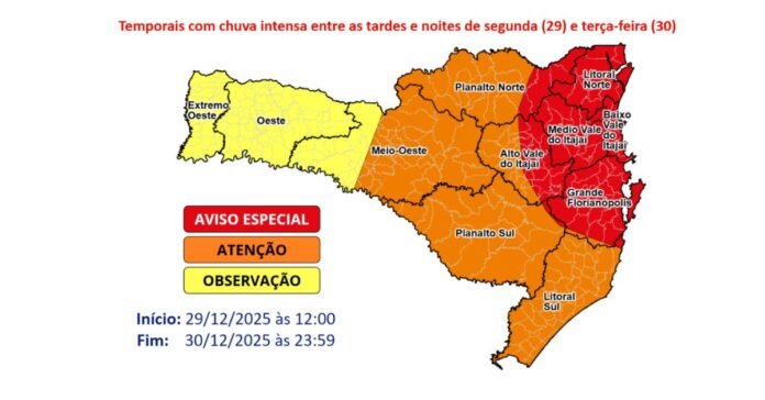 Na segunda-feira (29), os temporais se formam a partir da tarde e podem provocar chuvas intensas em curto período de tempo, aumentando o risco para alagamentos e enxurradas. O risco é muito alto nas áreas do Planalto Norte, Litoral Norte, Vale do Itajaí e Grande Florianópolis e parte do Litoral Sul, especialmente entre o meio da tarde e o início da noite.