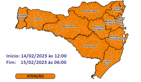 Os temporais associados a aproximação dessa frente devem iniciar no período da tarde pelo Grande Oeste, avançando em direção ao centro leste catarinense ao longo da noite da terça (14) e da madrugada da quarta (15), quando o sistema já atua sobre . O risco é alto para ocorrências associadas nas áreas em laranja do mapa.
