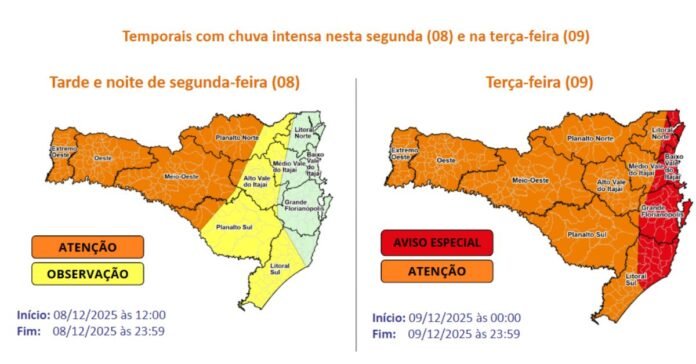 Ao longo da tarde e noite de segunda (08), há condições para temporais com chuva intensa, rajadas de vento e eventual queda de granizo, especialmente no Grande Oeste e Planalto Norte, onde não se descarta a ocorrência de tempestades severas. O risco é MODERADO a ALTO para ocorrências como alagamentos, enxurradas, destelhamentos, queda de galhos e árvores e danos na rede elétrica.