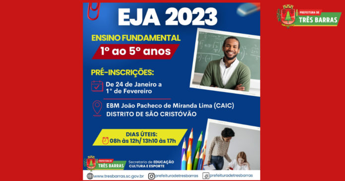 A Educação de Jovens e Adultos (EJA) de Três Barras realiza, entre os dias 24 de janeiro e 1° de fevereiro, inscrições para o ensino fundamental I – do 1° ao 5° anos – para jovens com idade mínima de 15 anos.