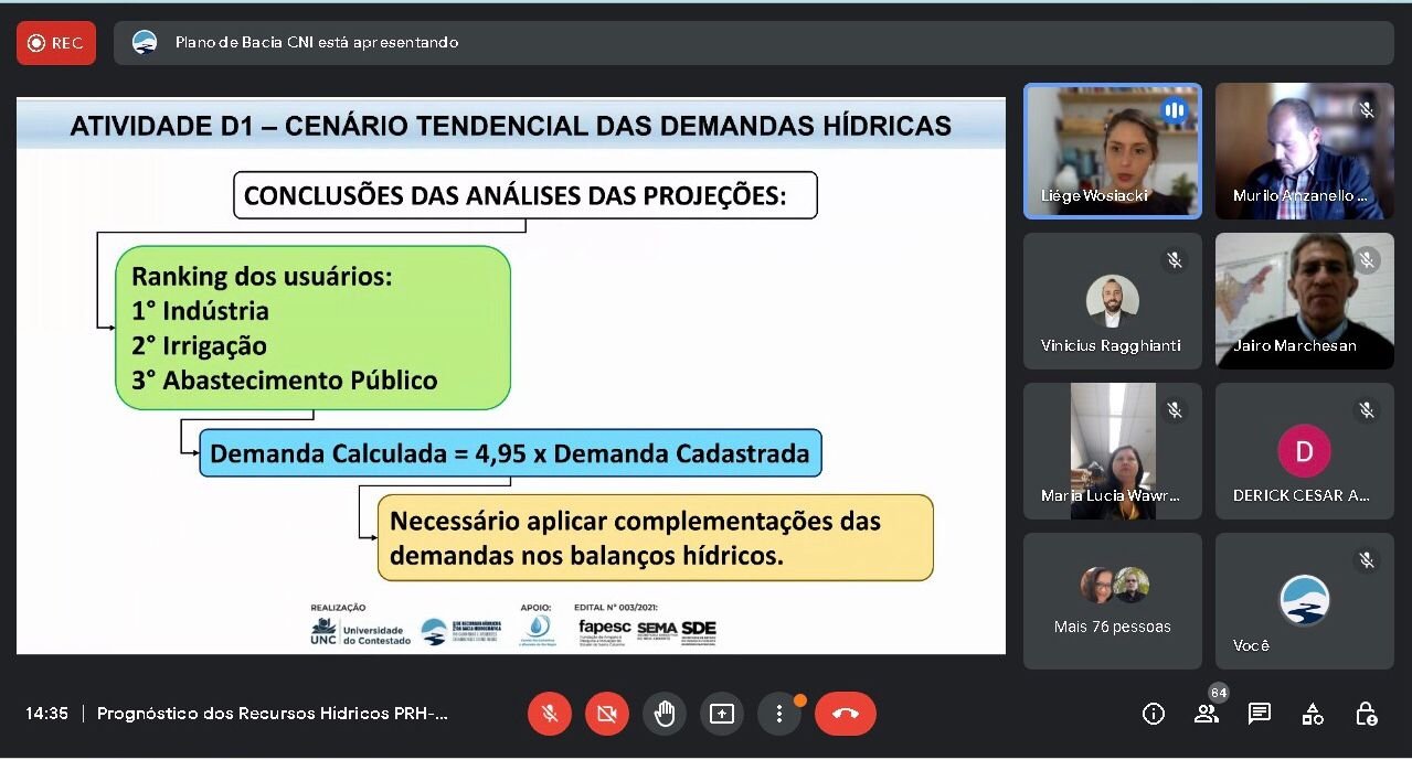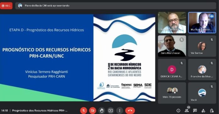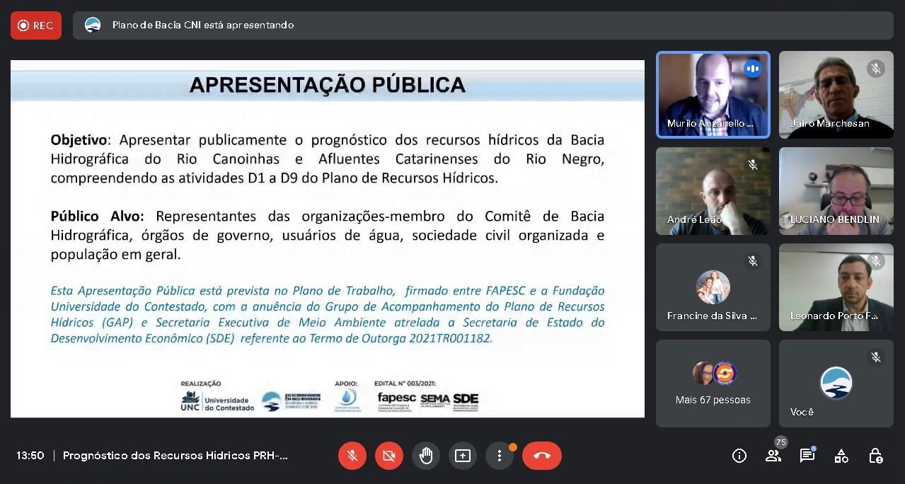 No dia 27 de setembro de 2022, ocorreu, de forma virtual, a Apresentação Pública de parte do Prognóstico dos Recursos Hídricos da Bacia Hidrográfica do Rio Canoinhas e Afluentes Catarinenses do Rio Negro (Atividades D1 à D9), promovida pela Universidade do Contestado (UNC), instituição responsável pela elaboração do Plano de Recursos Hídricos (Etapas D e E), com apoio da Fapesc, do Comitê Canoinhas e da Secretaria Executiva de Meio Ambiente de Santa Catarina – Sema/SC, integrante da Secretaria de Estado do Desenvolvimento Econômico Sustentável – SDE/SC.