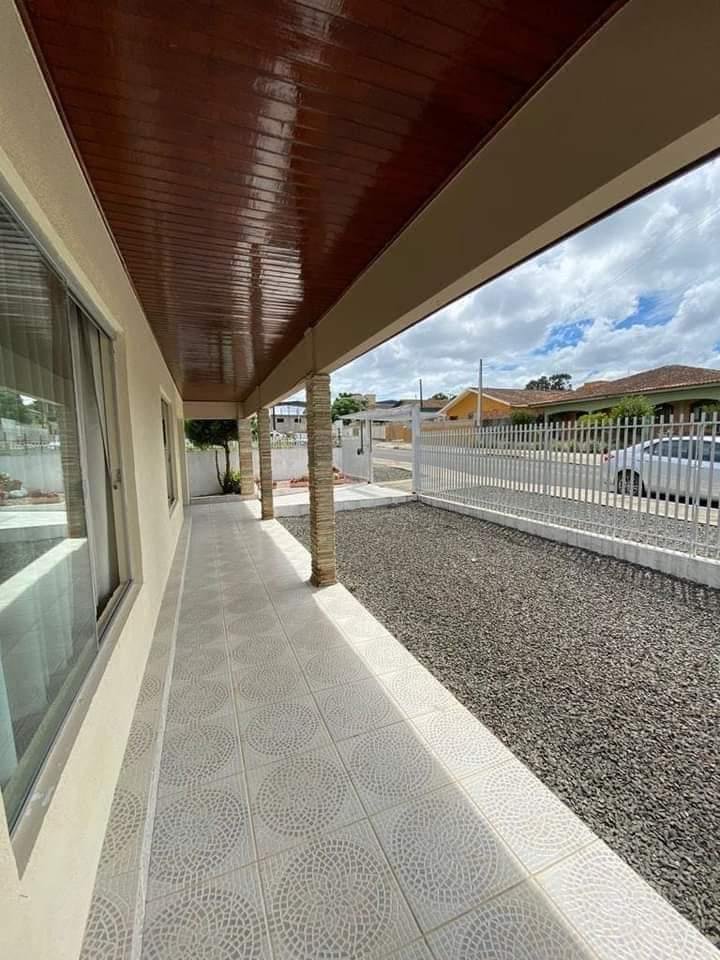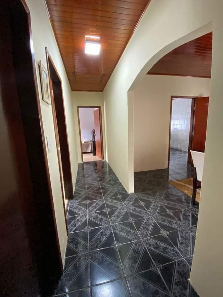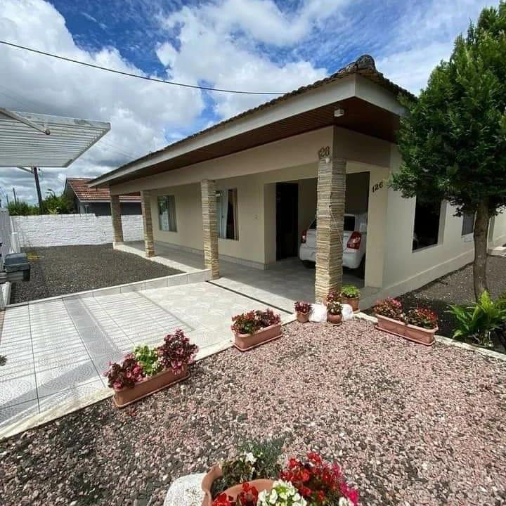 Casa de alvenaria em excelente condições tendo 145m² de área construída, terreno com 486 m², com muros ao redor do terreno, portão elétrico. Com pedras ao redor da casa e uma área com grama nos fundos.