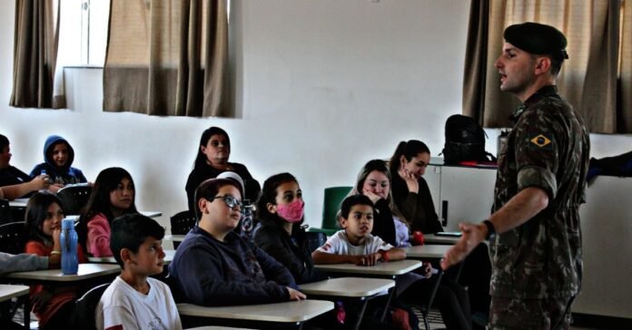 Na manhã e tarde desta quarta-feira, 28, dando continuidade ao – Projeto Conhecendo Nossa História – os militares do Campo de Instrução Marechal Hermes – CIMH estiveram na Escola Básica Municipal Castelo Branco, de Canoinhas, ministrando palestra aos alunos daquela instituição.