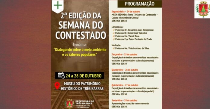 Sob a temática “Dialogando sobre o meio ambiente e os saberes populares”, a Prefeitura de Três Barras, por meio da secretaria municipal de Educação, Cultura e Esporte, realiza entre os dias 24 e 28 de outubro a 2ª edição da Semana do Contestado.