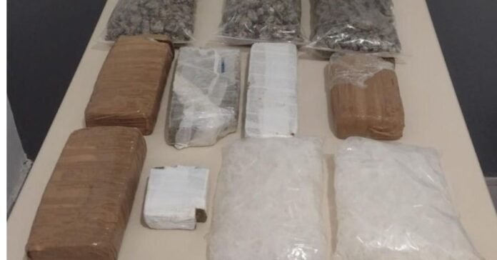Na delegacia após pesagem do entorpecente, aferiu em 4,400 kg de maconha em tabletes prensados, e 1,250 kg da espécie moruga (skunk), e mais 150 gramas de cocaína, e dois pacotes plásticos com diversos pinos utilizados como embalagens para substância análoga a cocaína.