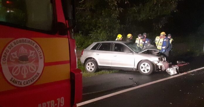 No automóvel, Audi A3 1.8, cor prata, placa de São Bento do Sul, havia apenas o condutor de 58 anos, que se encontrava no banco do motorista em encarceramento, em óbito no local.