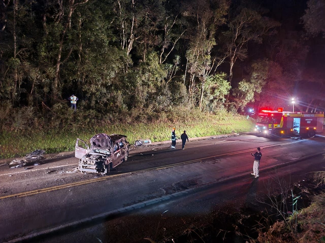 Ainda cabe ressaltar que no local encontravam-se em apoio PM e PRF, sendo que esta gerenciava o trânsito e a PM conjuntamente com as guarnições do ABTR-79 e ABTR-202 realizaram buscas de possíveis outras vítimas ejetadas no perímetro todo da cena do capotamento, desde o local onde havia a primeira marca no asfalto do capotamento até o local onde encontrava-se o veículo, nada encontrado.