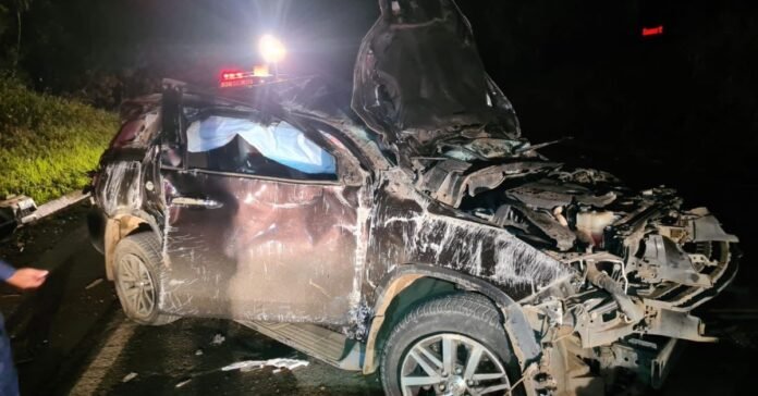 No local foi encontrado o veículo Toyota Hilux SW4 sobre a via de rolamento, toda destruída após diversos capotamento.
