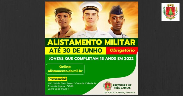 A inscrição pode ser feita de maneira online, através do site alistamento.eb.mil.br ou de forma presencial junto à 119ª Junta de Serviço Militar (JSM) de Três Barras, que funciona na Casa da Cidadania, situada à Avenida Rigesa n°2588, no bairro João Paulo II.