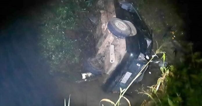 Com o impacto o caminhão acabou tombando na rodovia e o veículo de passeio capotou e depois caiu em um córrego.