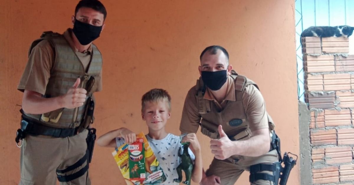 Após finalizar a ocorrência, o filho do casal, relatou que não havia ganho um presente e que pediu um dinossauro para o papai Noel,  comovidos com o relato os policiais Sd. Pavan e Sd. Marcelo.
