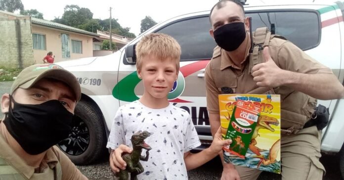 Após finalizar a ocorrência, o filho do casal, relatou que não havia ganho um presente e que pediu um dinossauro para o papai Noel,  comovidos com o relato os policiais Sd. Pavan e Sd. Marcelo.