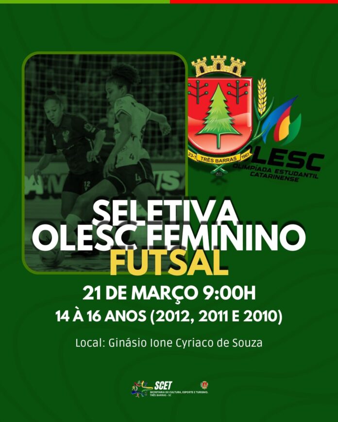 O Ginásio de Esportes Ione Cyríaco de Souza será o palco, neste sábado (21), de uma importante oportunidade para as jovens talentas do esporte regional. A partir das 09h, a cidade de Três Barras realiza a seletiva oficial de futsal feminino para compor a equipe que disputará a OLESC (Olimpíada Estudantil Catarinense).