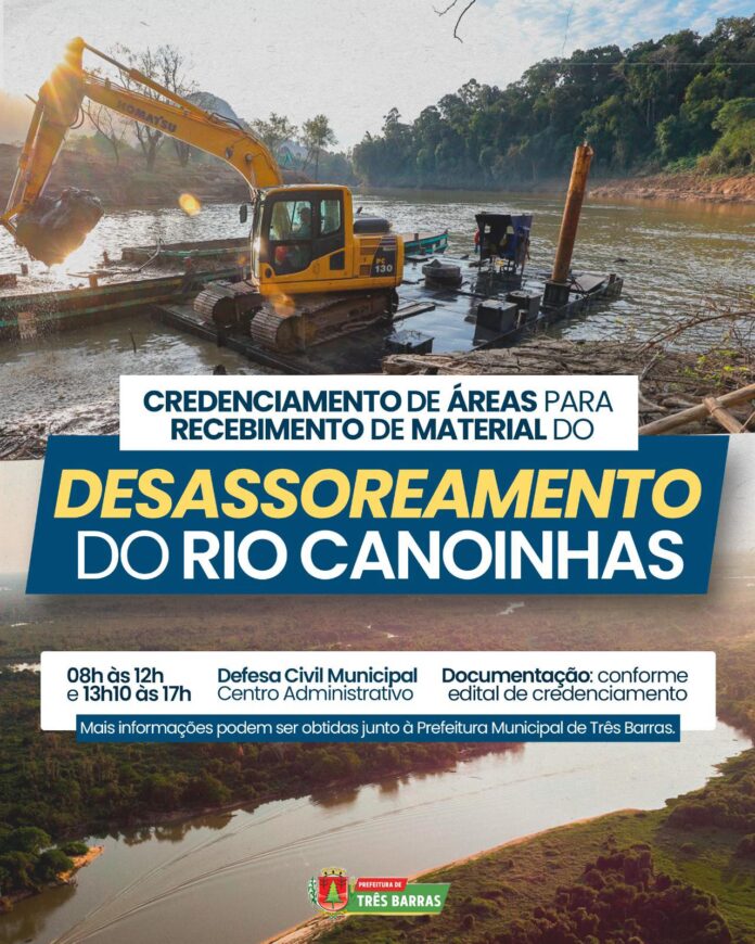 O Município de Três Barras informa que está aberto o credenciamento de proprietários de imóveis interessados em disponibilizar áreas para recebimento de material proveniente do desassoreamento do Rio Canoinhas, no trecho que circunda o Distrito de São Cristóvão.