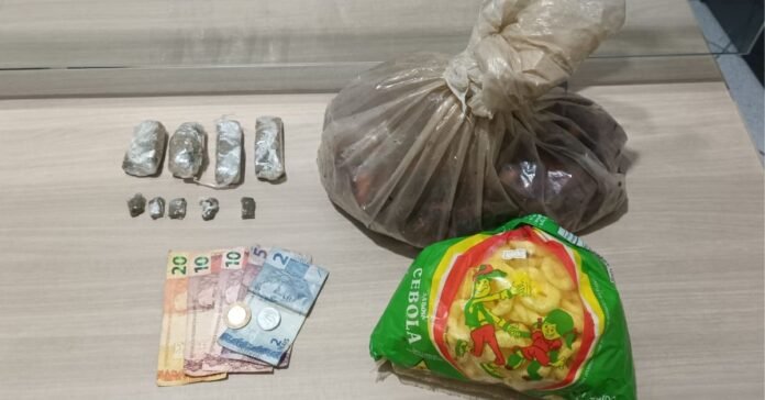 A substância apreendida foi encontrada nas vestes do abordado (calção/bolso direito) quantia aproximada de 6,5 gramas e em meio a uma sacola de pinhão no bagageiro da bicicleta quantia aproximada de 102 gramas (forma de dissimular e dificultar o trabalho policial).