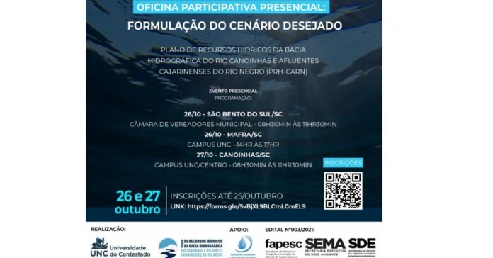 O evento ocorrerá de maneira presencial nos municípios de São Bento do Sul, na Câmara de Vereadores (dia 26/10, às 8h30), de Mafra (dia 26/10, as 14h00) e de Canoinhas (27/10, as 8h30), nos respectivos campi da Universidade do Contestado (UNC). A ação, que objetiva a participação do público local, aproveitando a experiência e a vivência dos representantes envolvidos, englobará uma apresentação técnica sobre a temática, conduzida pela coordenação e pesquisadores do Projeto, com informações inerentes ao balanço hídrico gerado para as bacias hidrográficas e a adoção de metodologia participativa, com o uso de ferramentas de geoprocessamento – Geoweb – com interação do público presente, para discussão e decisão dos cenários propostos (rio que temos, rio que queremos e rio que podemos ter), e obtenção da proposta de enquadramento dos recursos hídricos da Bacia Hidrográfica do Rio Canoinhas e Afluentes Catarinenses do Rio Negro (BH-CARN). Posteriormente, haverá espaço para interação com o público, avaliação da oficina e dos resultados alcançados pela pesquisa.