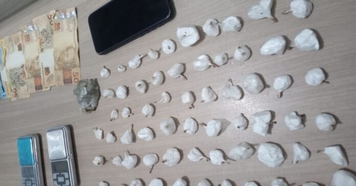 De imediato, o referido confessou a traficância, sendo encontrados no imóvel, 184 gramas de cocaína, fracionado em 63 porções, prontas para venda, uma porção de maconha, pesando aproximadamente 21 gramas, 458 reais em espécie, duas balanças de precisão e um aparelho celular marca Motorola.