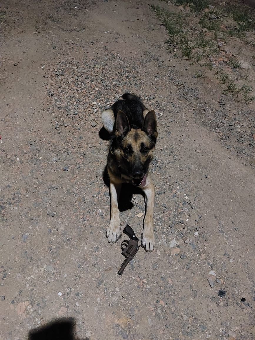 Em buscas na casa, o cão mudou o comportamento apontando para um móvel na cozinha da casa. Foi efetuado buscas nesse cômodo e localizado um revólver .38, com três munições intactas. Ainda, em cima da geladeira foi localizada uma porção de maconha pesando aproximadamente 01 grama.