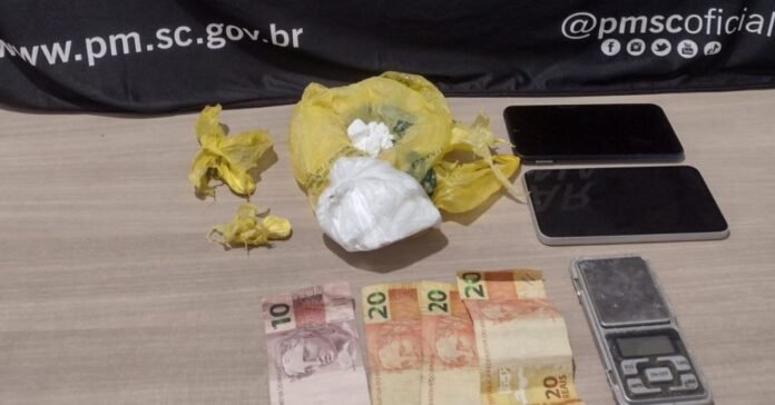 No momento da abordagem, os policiais perceberam que ele tentou dispensar algo, que posteriormente foi identificado com duas porções de cocaína, totalizando aproximadamente 3,5 gramas.