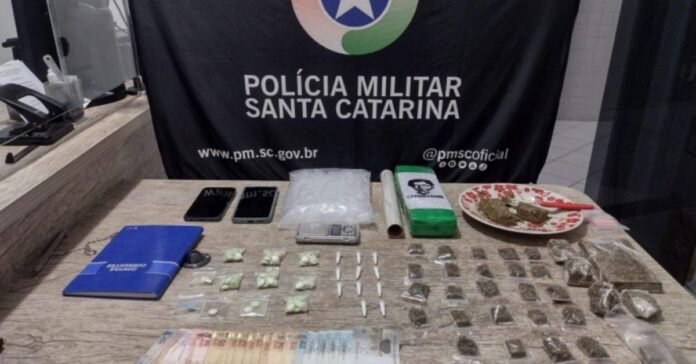 O suspeito foi preso em flagrante e, juntamente com os entorpecentes, objetos e dinheiro,