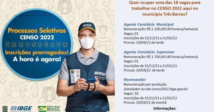 Foi prorrogado o prazo para inscrições no concurso do Instituto Brasileiro de Geografia e Estatística (IBGE) para trabalhar no Censo 2022. As inscrições podem ser realizadas até dia 21 de janeiro. Somente em Santa Catarina são mais de 7 mil vagas temporárias para os cargos de Recenseador, Agente Censitário Municipal (ACM) ou Agente Censitário Supervisor (ACS).