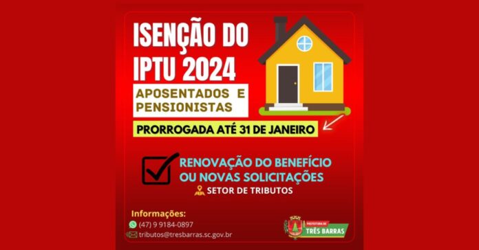 Foi prorrogado, até 31 de janeiro, o prazo para que os contribuintes isentos do pagamento do Imposto Predial e Territorial Urbano (IPTU) assinem junto, ao setor de Tributos da Prefeitura de Três Barras, a renovação do benefício para o exercício de 2024.