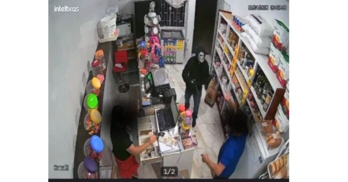 Inicialmente, o suspeito passou em frente ao comércio e, após cerca de um minuto, retornou utilizando uma máscara prateada, momento em que adentrou o estabelecimento.