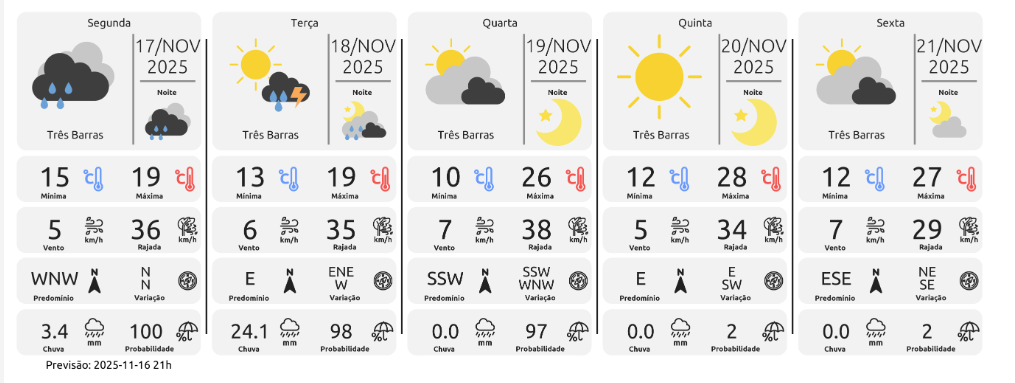 InícioVariedadesSemana deve ser de chuva e templo nublado Variedades Semana deve ser de chuva e templo nublado Por: Equipe A Gazeta Tresbarrense 17 de novembro de 2025 FacebookTwitterPinterestWhatsApp Últimas notícias Educação Enem 2025: pedido de reaplicação de provas começa nesta segunda Os participantes que perderam a aplicação de um ou... Polícia Policial sofre fratura e outro fica ferido durante ocorrência Nesse sábado, 15, por volta das 09h, as guarnições... Destaque Durante abordagem homem é pego com drogas e pilotando sem CNH em Três Barras Nesse domingo, 16, aproximadamente às 16h15min, a polícia militar... - Anúncio -De acordo com a previsão da Epagri/Ciram a semana deve ser de chuva e tempo nublado, confira a previsão: - Anúncio - Equipe A Gazeta TresbarrenseSomos um jornal regional com mais de 20 anos de existência.