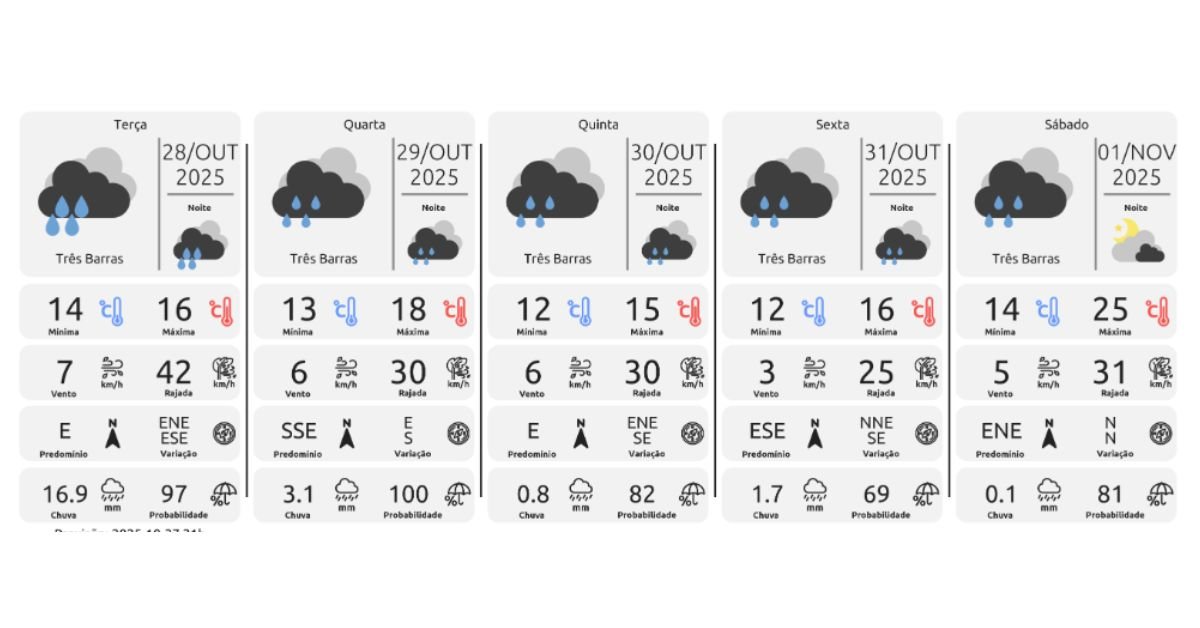 Três Barras, deve enfrentar uma semana marcada por chuvas frequentes e temperaturas baixas para o período. De acordo com a previsão meteorológica, o tempo firme só deve retornar no fim de semana, com elevação mais acentuada das temperaturas.
