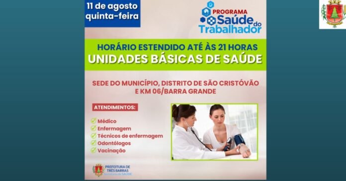 Para contemplar, principalmente, as pessoas que trabalharam fora e não têm como buscar atendimentos durante o horário comercial é que as unidades básicas de saúde (UBS) de Três Barras ficarão abertas até às 21h nesta quinta-feira, 11 de agosto