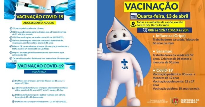 Haverá doses disponíveis contra a covid-19 para as pessoas com 05 anos ou mais; contra o vírus Influenza, que provoca a gripe, para trabalhadores da saúde e idosos com 60 anos ou mais; e, ainda, a vacina contra o Sarampo para os trabalhadores da saúde de até 59 anos e crianças de 06 meses a menores de 05 anos.