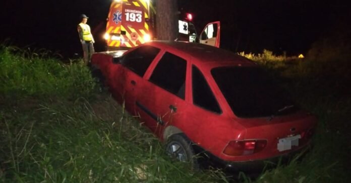 Chegando no local foi confirmada a natureza da ocorrência, onde foi encontrado um veículo Ford Escort com placas de Três Barras, que saiu de pista.