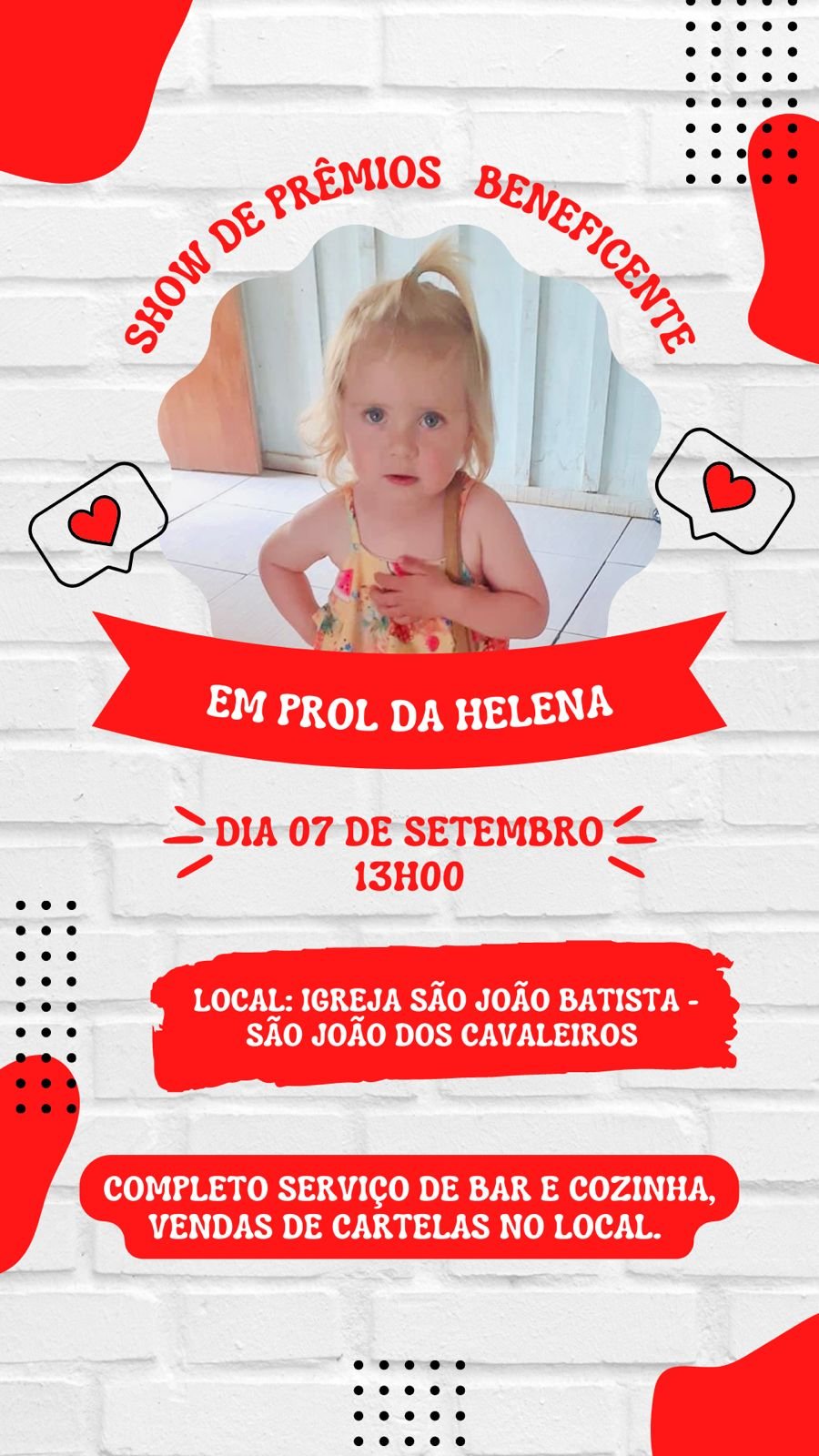 O evento será realizado em prol da pequena Helena, de quatro anos de idade, a qual precisa de leite, sondas e outras necessidade médicas.