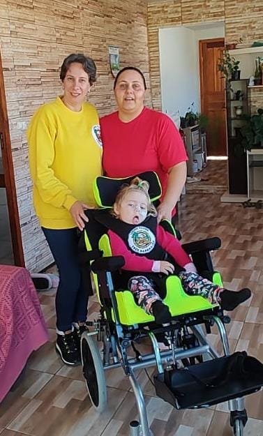 A linda e pequena Helena possui um tumor no coração e sofreu uma parada cardíaca, que gerou problemas de locomoção, assim fazendo necessário o uso da cadeira. A qual foi doada pelo Lions Clube Três Barras.
