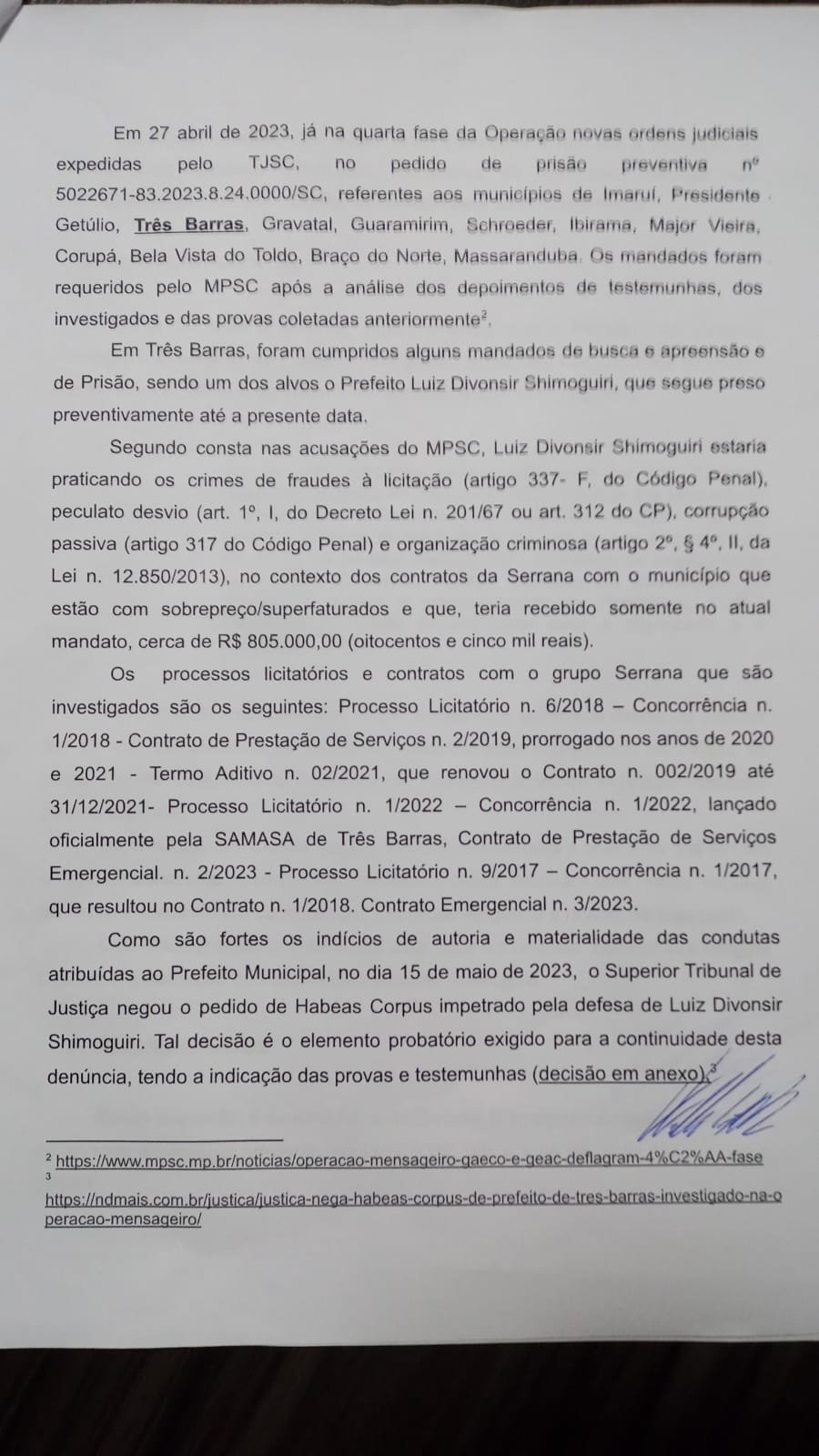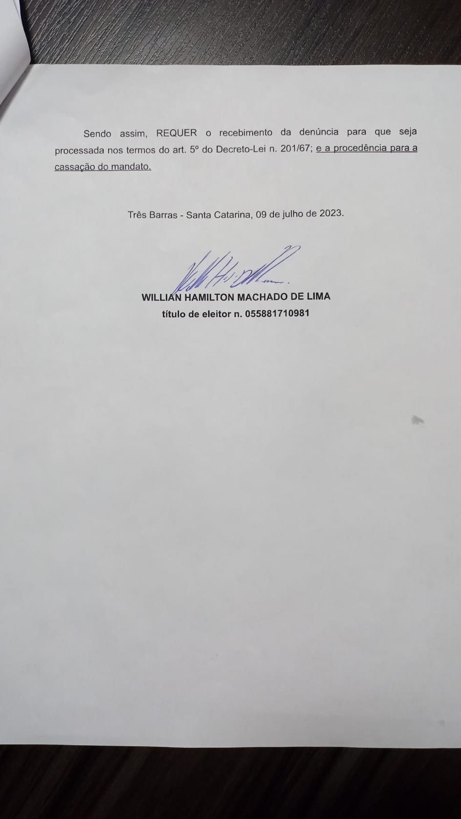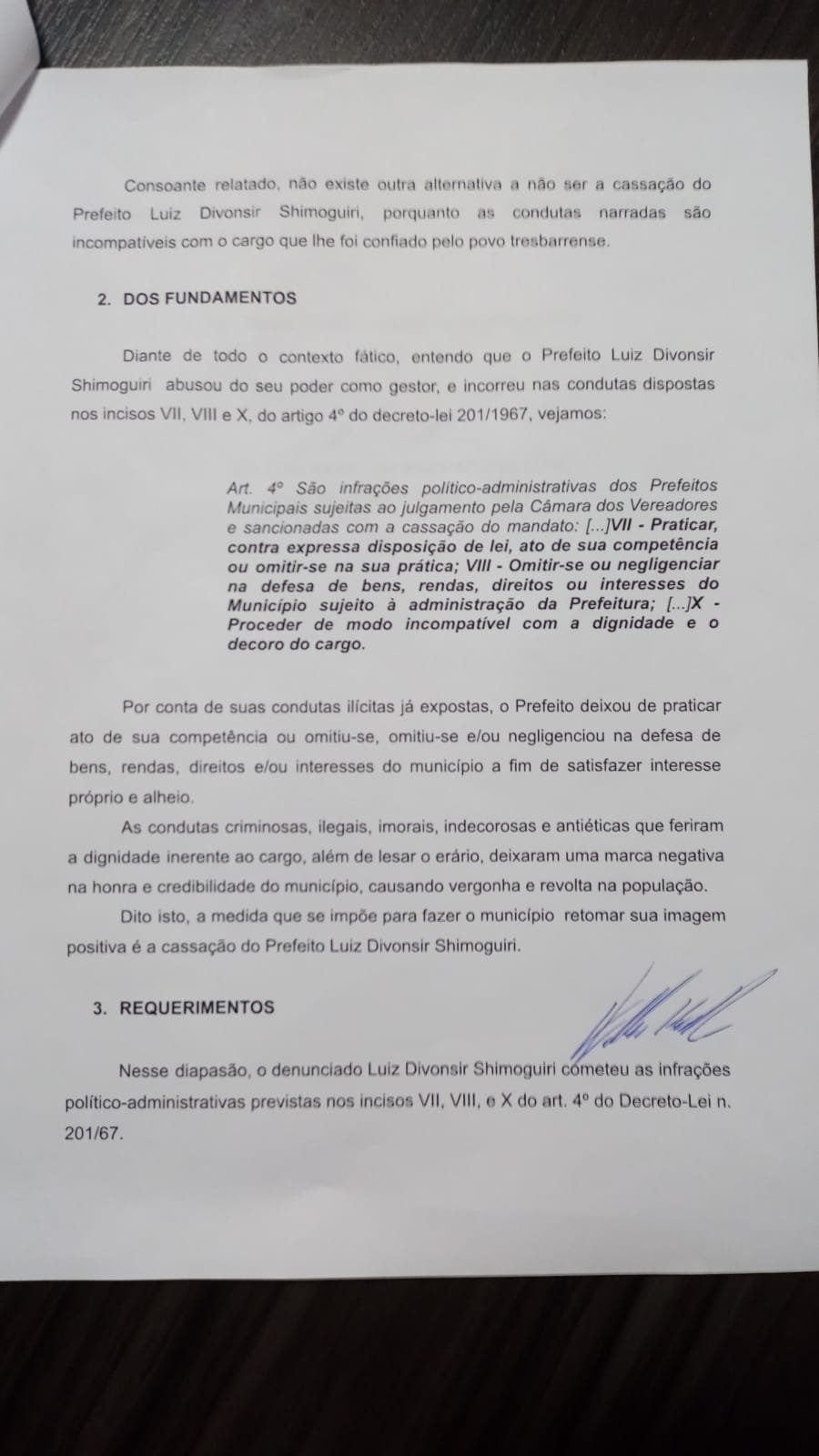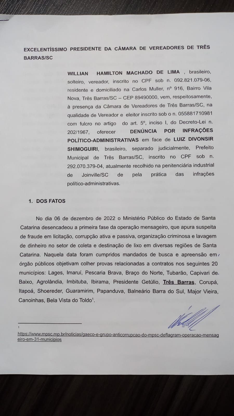 Na sessão da câmara de vereadores de Três Barras, nesta segunda-feira, 10 e julho, o vereador Willian Hamilton Machado De Lima (Cidadania) protocolou o pedido de cassação do prefeito preso, Luiz Divonsir Shimoguiri.